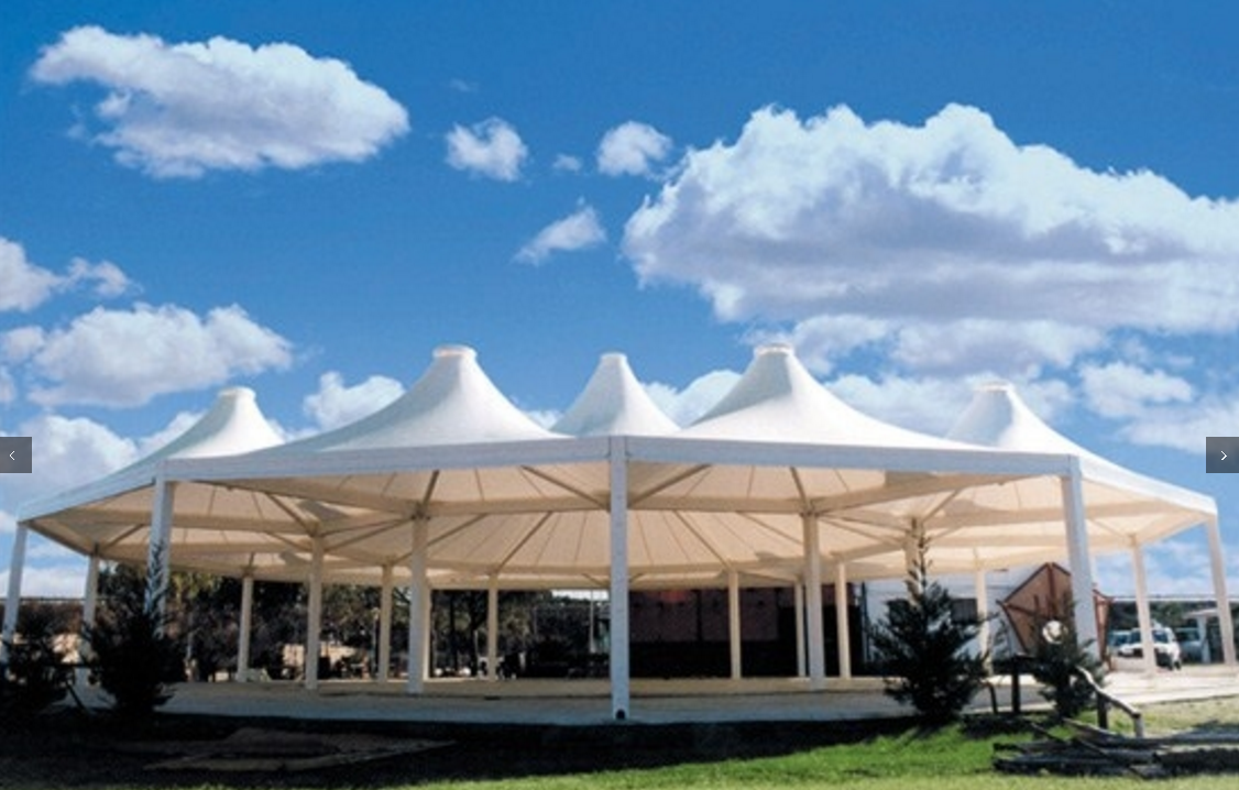 Struttura portante componibile in acciaio zincato con eventuali verniciature elettrostatiche a polveri poliesteri. Copertura in tessuto PVC alta resistenza a forma piramidale messa in tensione mediante sistema a pressione posto alla sommità.